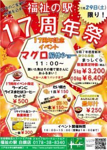 11月29日(土)ふくしの駅では17周年祭と題し、日頃のご愛顧に感謝を込めまして色々な催し物を開催いたします。