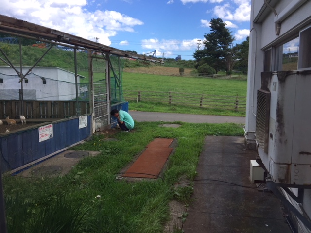 上の写真は、彼の行動パターンになっている昼休みのランニングをしていた際の写真です。彼は、急な変更もとても苦手です。日々の生活が大体パターン化されています。でも、この写真は、いつもの行動パターンを自ら崩し、ウサギを見ている写真です。それも、にこやかに。