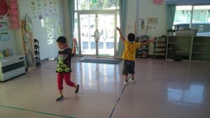 学校でなわとびをしているのか、2人とも部屋の中をいっぱいに使って跳ぼうとしています。