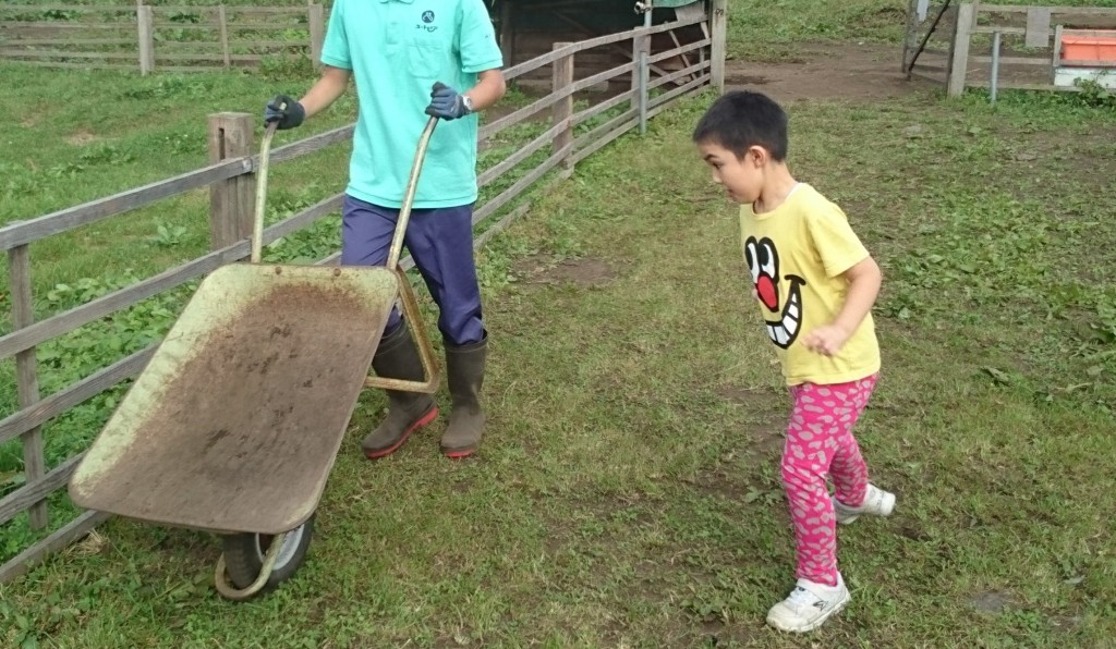R君は、ポニーのお世話をしているお兄さんの扱う一輪車に、興味津々でついて行きます。
