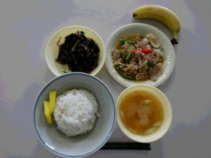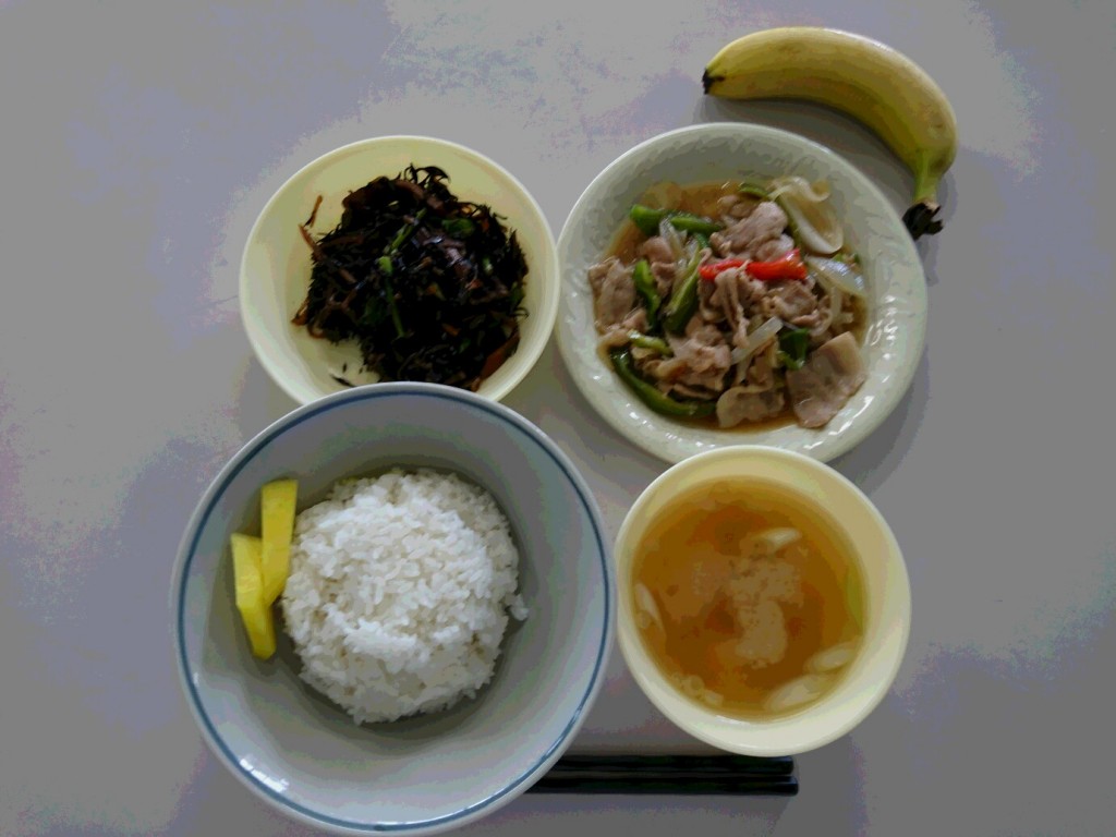 ○豚肉生姜焼き(玉葱・ピーマン) ひじき煮物(インゲン・さつま揚げ・人参・糸こん・干し椎茸) 味噌汁(大根・ねぎ・油揚げ・高野豆腐) デザート バナナ