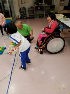 車イスのAちゃんは上に投げるのが難しいので、下のかごに向かって投げます。