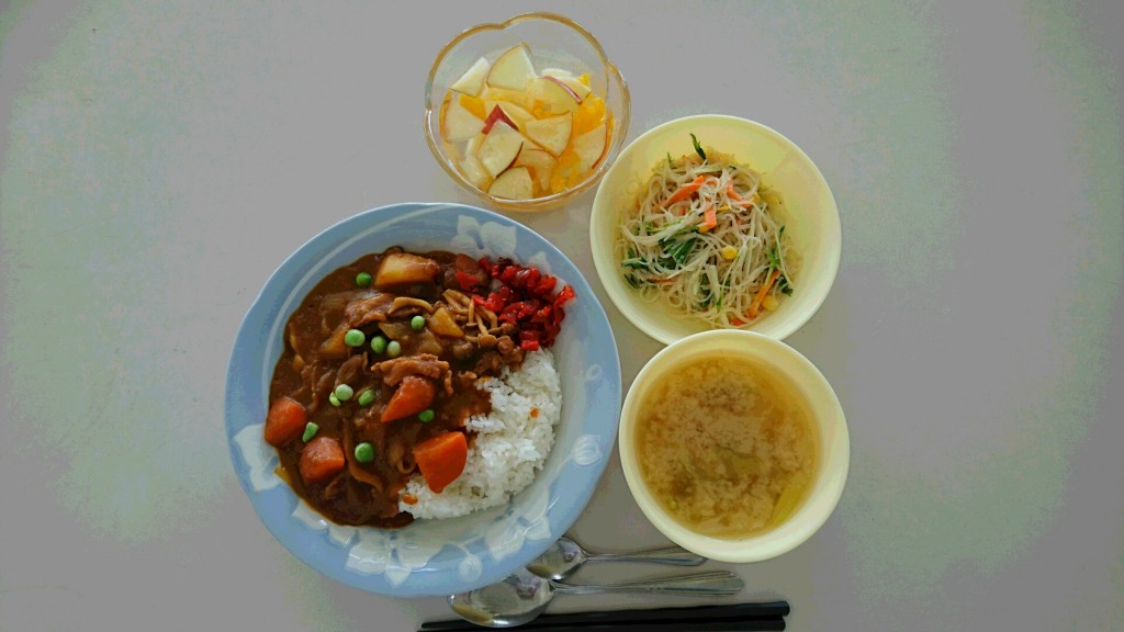 ○ハヤシライス(牛肉・玉葱・エリンギ・しめじ・人参・ジャガ芋・グリンピース)・福神漬け