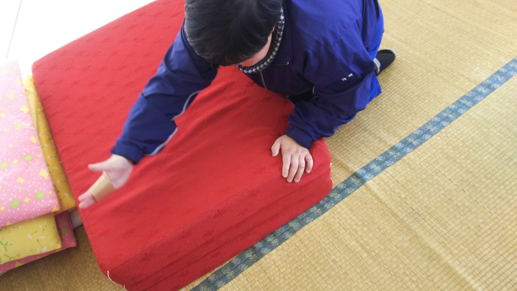 寄付でいただいたマットのほこり取り中のHさん。この日は複数のマットやソファーベッドなど大物の寄付が入り、すぐに売場に出そうときれいにしてもらいました。