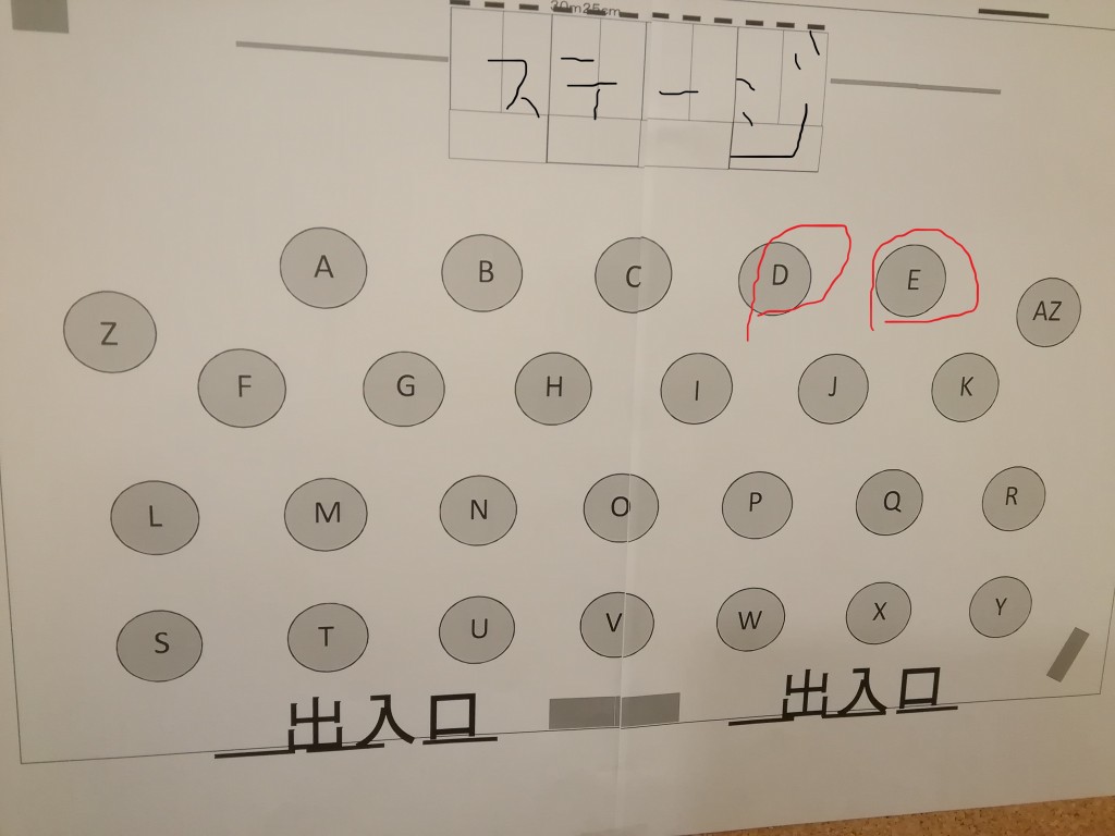 申込が早かったせいか、ステージの目の前の席(写真のDとE)に座ることが出来ました。