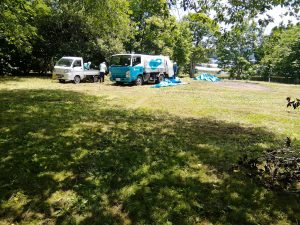いつもは段ボール回収に役立っているパッカー車が集草にも大活躍です。