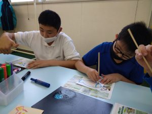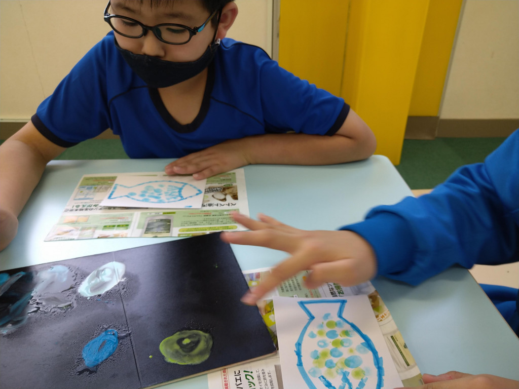 割りばしや指を使ってポンポンとスタンプして、1回目は魚を描きました。