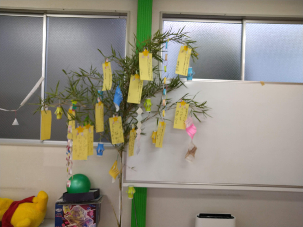 スタッフの家から笹を切ってきてもらい、願い事を書いた短冊も飾りました。