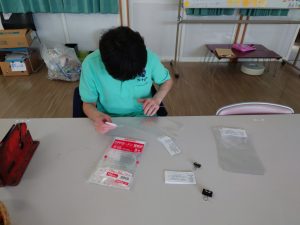まずは、ある程度みんなで拭き始め、その後Cさんが袋にラベル入れを行います。