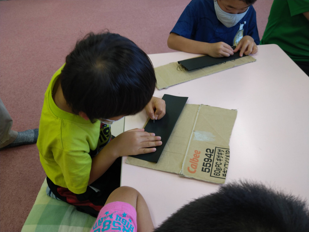 黒い画用紙に、画鋲でチクチク穴を開けていきます。ダンボールを敷いているので