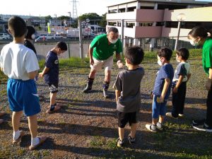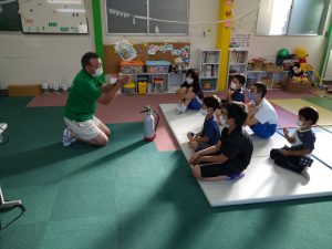 ※衣服についた火を手で払ってもなかなか消えない。転がるのがいいそうです。このコロコロは、動画「それゆけ!キッズ防災教室」で紹介されていました。今日の避難では、マスクで口を押さえて、姿勢を低くして、外まで避難しました。少しおしゃべりをしてしまった子もいましたが、支援員の指示・誘導のもと避難することができました。