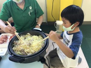 小一S君は、プレートに触れない様にねと指導員からの注意を聞いて、気をつけながら具材を炒める事が出来ました✨