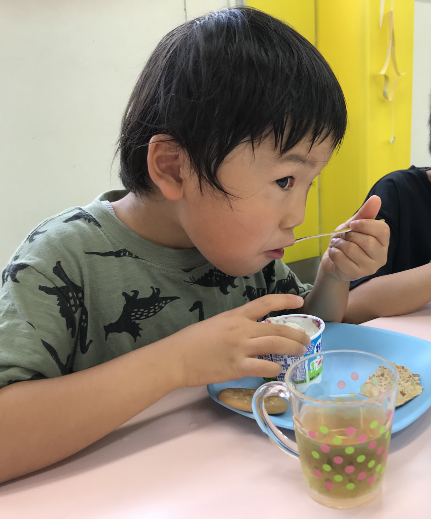 今回の頑張りどころは、クリームチーズを混ぜる作業です!指導員より、「ヨーグルトカップから溢さないようにゆっくり、クリームチーズを潰しながら良く混ぜましょう」と伝えてみんな一生懸命頑張りました😊