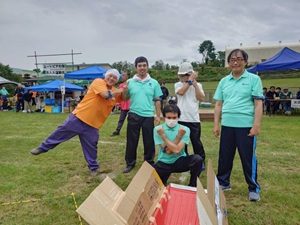 我らが青組は惜しくも最下位となってしまいましたが、皆応援での声だしや、競技参加で頑張ってくれていました。中には走る競技の1位を目前として転んでしまう利用者さんもいましたが、悔しいのか走る事を練習すると話したり「あの時〇〇だったら1位取れたかも」と話す人もいて、真剣に楽しみ、競っていたのだと感じました。