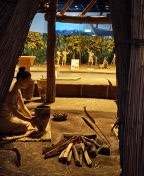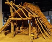 六ヶ所村郷土館では、縄文時代の土器を時代別に展示してジオラマ、狩や竪穴住居での生活の様子を復元など展示していた。