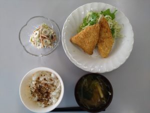 〇アジフライ・白身フライ(キャベツ・京菜) ごぼうサラダ(キャベツ・ちくわ) 味噌汁(小松菜・油揚げ) ご飯