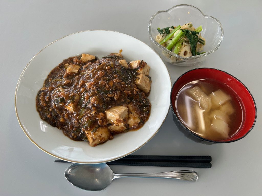 マーボー丼(豆腐、ひき肉、ニラ、玉ねぎ)