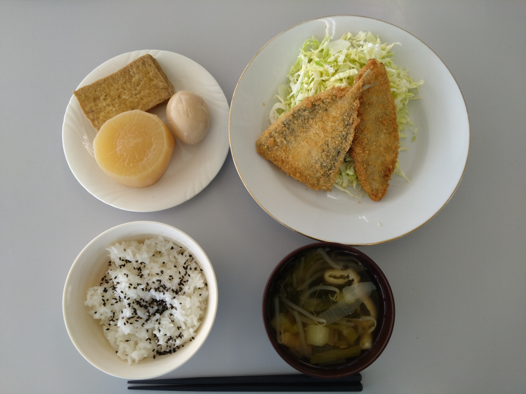 1/22 アジフライ・白身フライ(キャベツ) おでん(大根・厚揚げ・卵) 味噌汁(小松菜・もやし・油揚げ) ご飯