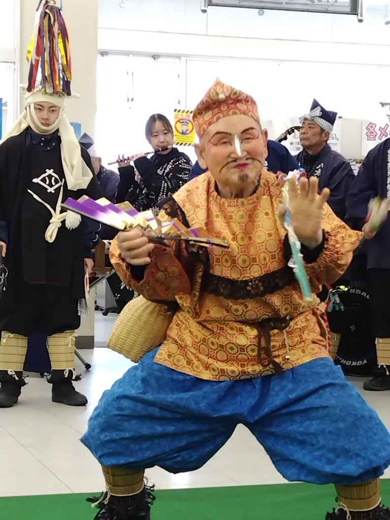 舞手の「太夫」が被る烏帽子は馬の頭をかたどったもので、鶴、亀、松、竹、梅などをあしらい、豊作を願ったもの。今年は午年でもありますので、「(馬)うまくいく、良い年でありますように」と願いながらえんぶり鑑賞してきました。