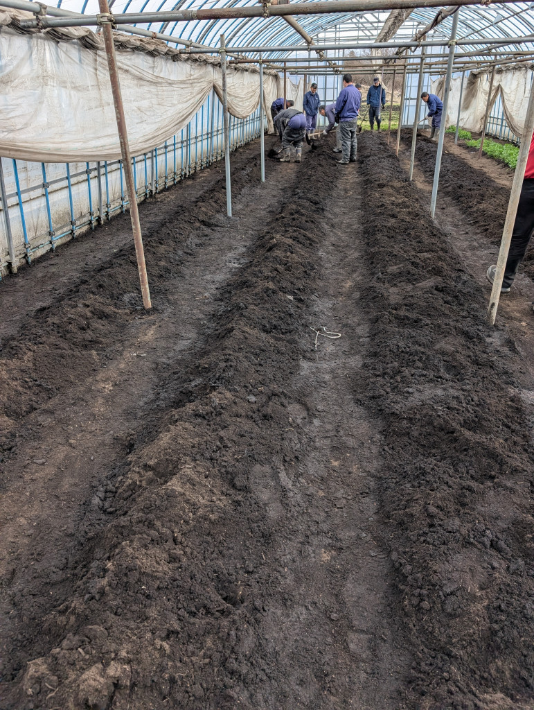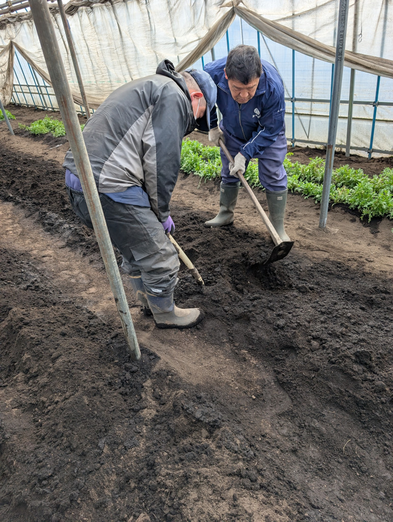 たっぷり水をまいたあと、スコップや鍬を使ってしっかりと撹拌しています。これがなかなかの重労働なんですが、みんな汗を流しながら頑張っております!