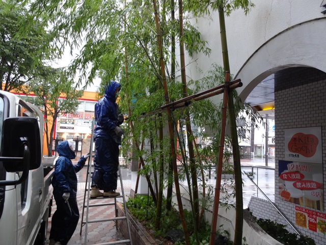 弱い笹を一緒にしばっていただいた。こんな日に申し訳ない。