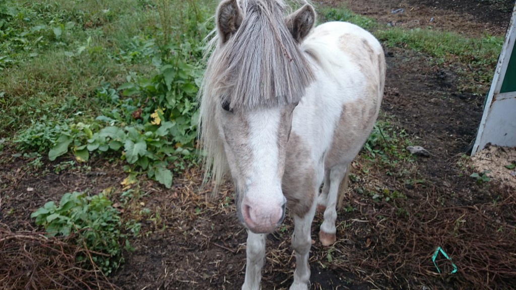 まきばにいるポニーちゃん達を見たことがある方は気づいていると思いますが、前髪が伸び放題で可愛い目が隠れていました。特に白い毛色の「ユキ」ちゃんは前髪を切ろうとすると暴れるんです。何度か試みては失敗を繰り返してきましたが、ついに昨日前髪を切りました。