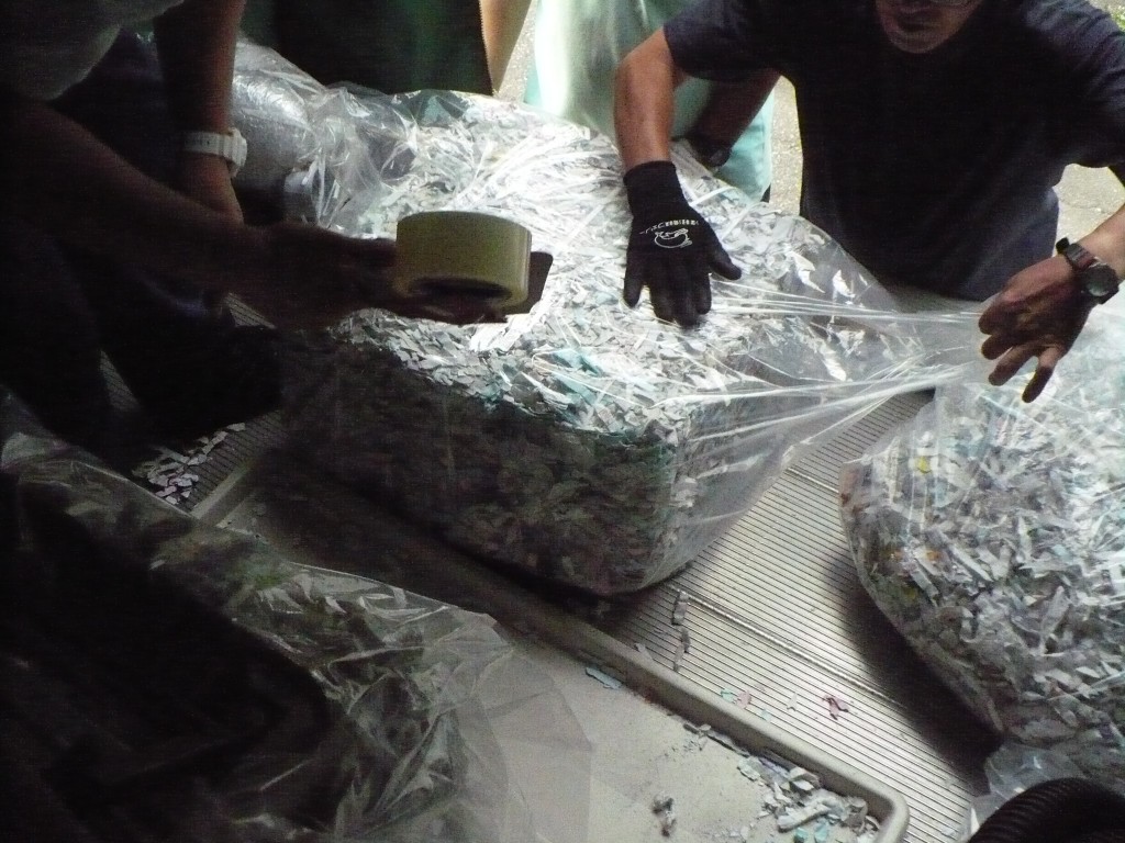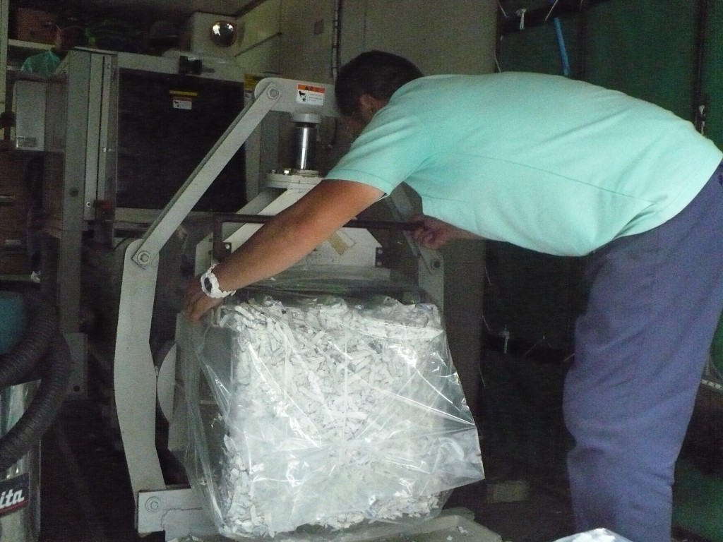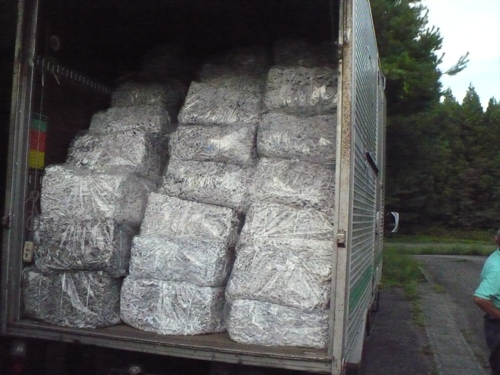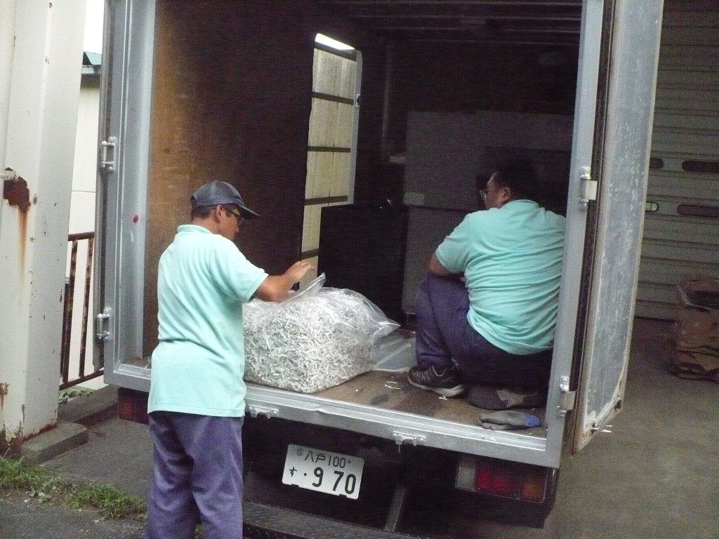 袋詰めしたシュレッダーを運搬車両に載せたところ