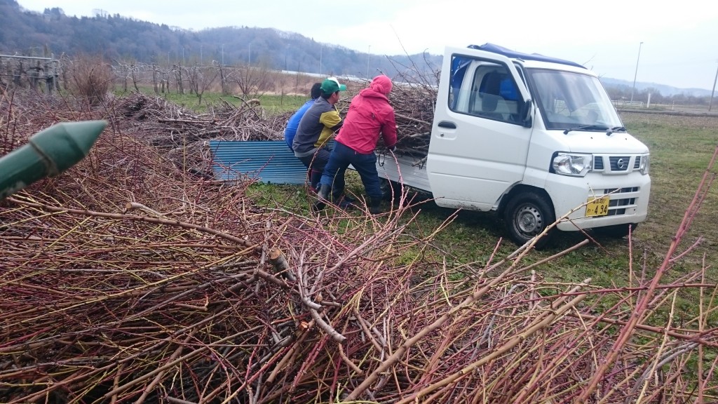 りんごの枝片付け作業             苗植え作業