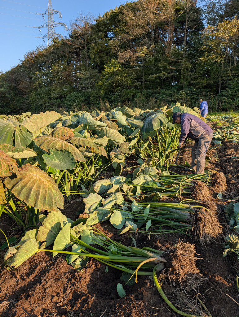 里芋の葉がすっかり秋色に変わり、本日も働き隊のメンバーと一緒に収穫作業を進めてきました。