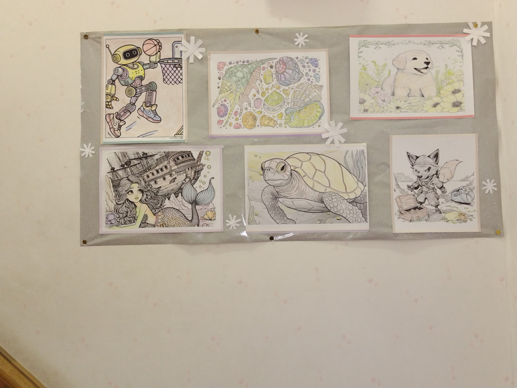 皆さん、こんにちは。ジョイフルのキャノンです。週末にはグループホームに塗り絵も持ち帰り、余暇を楽しむべく塗っている利用者のKさん。「どれ塗ろうかなぁ??ここは、〇〇色でいいかな?」スタッフと相談しながらどの塗り絵にするか決めています。週末ごとに塗りためてきたものが増えてきたのでこの度、Kさんギャラリーを更新しました。階段の踊り場のところへ掲示しているので、他の利用者さんもスタッフも毎日目にすることが出来ます。