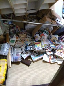 本棚が倒れて、本が部屋中に散乱していて、足の踏み場がありません。